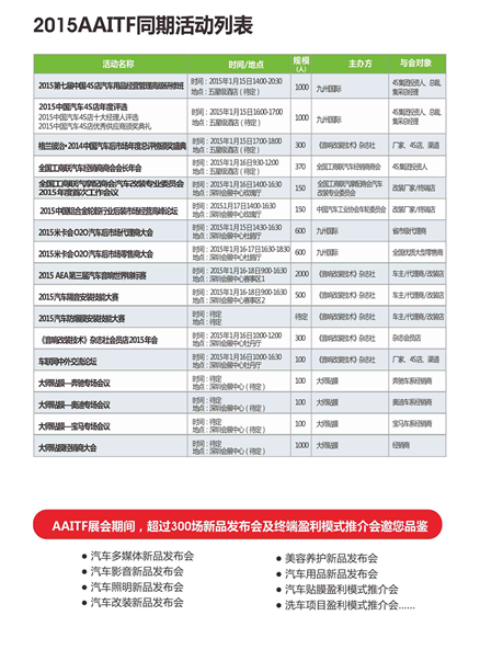 國際汽車改裝服務(wù)業(yè)展覽會(huì)(AAITF)于2006年創(chuàng)辦,憑借豐富的行業(yè)積累、精準(zhǔn)的展會(huì)定位及全面的推廣渠道,成為中國汽車后市場全產(chǎn)業(yè)鏈唯一的全球貿(mào)易平臺(tái)。秉承往年的豐碩成績,2015116-18日于深圳會(huì)展中心將盛大續(xù)辦的AAITF 2015 深圳展,大會(huì)以“品牌、科技、環(huán)保”為主題,展出面積達(dá)22萬平米、8,000個(gè)展位、9個(gè)館精確分館分區(qū),匯聚全球500強(qiáng)企業(yè)及國內(nèi)3,000余家主流品牌企業(yè)總部直接參展,20,000新品全球首發(fā),一系列高規(guī)格同期活動(dòng)連番上演,預(yù)計(jì)吸引全球超過90個(gè)國家及地區(qū)的28萬來自汽車后市場全產(chǎn)業(yè)鏈優(yōu)質(zhì)買家和專業(yè)觀眾齊聚一堂、共襄盛會(huì)。