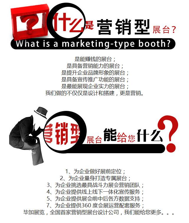 如果您覺得您的參展效果一直不理想,請找畢加展覽,營銷型展臺(tái)會(huì)幫你獲得以往2-3倍的參展效果。營銷型展臺(tái)是指以現(xiàn)代營銷理念為核心,基于企業(yè)營銷目標(biāo)進(jìn)行規(guī)劃,具有良好、完備的效果評(píng)估體系,能夠提供一系列的服務(wù),為客戶提高產(chǎn)品銷售業(yè)績和品牌知名度的營銷方案。