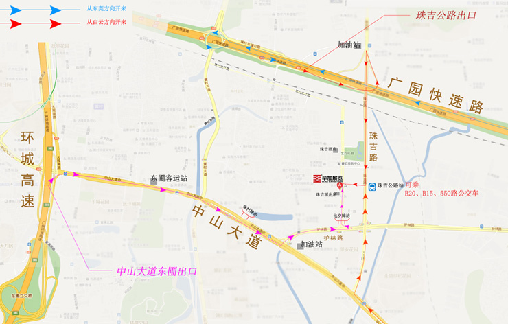 公交路線——550、B20、B15,在珠吉公路站下車,對面路口走進來200米;