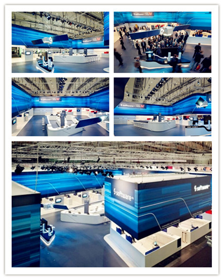 以上是SOFTWARE AG公司在漢諾威電腦展上的展臺設計,代表科技的藍色將將企業(yè)的行業(yè)特點表現(xiàn)得淋漓盡致,更營造了一種時尚先進的展臺氛圍。